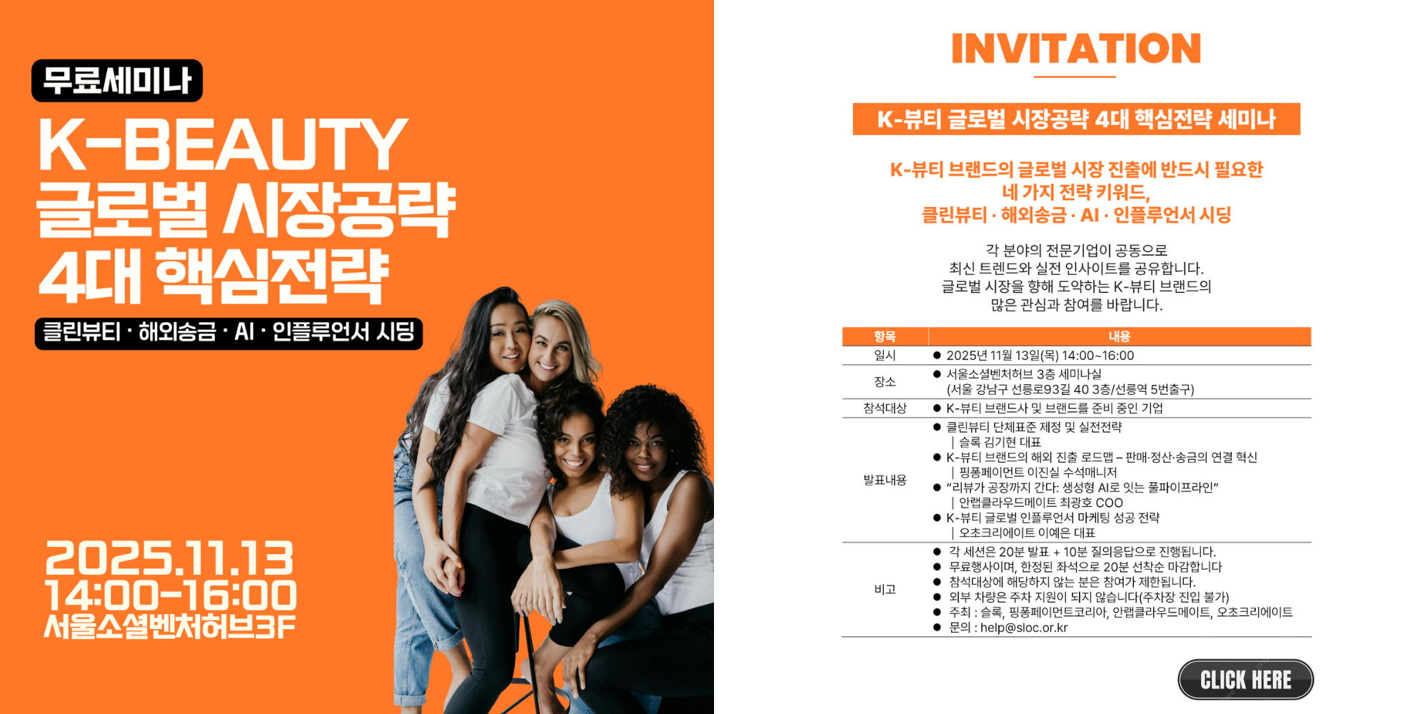 K-뷰티 브랜드의 글로벌 시장 진출에 반드시 필요한 네 가지 전략 키워드, 클린뷰티 · 해외송금 · AI · 인플루언서 시딩. 각 분야의 전문기업이 공동으로 최신 트렌드와 실전 인사이트를 공유합니다. 글로벌 시장을 향해 도약하는 K-뷰티 브랜드의 많은 관심과 참여를 바랍니다.