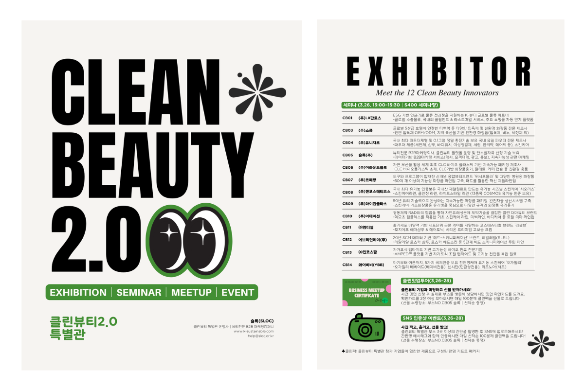 브랜드사 뿐만 아니라 원료, 패키징, OEM/ODM, 물류,마케팅까지 K-클린뷰티 밸류체인 전반을 이끄는 혁신 기업 12개사(슬록 포함하면 13개사)가 한자리에 모입니다. 단순 전시가 아니에요. 세미나 듣고, 1:1 밋업 하고, 이벤트 참여하고… 전시·세미나·밋업·이벤트가 동시에 펼쳐지는 비즈니스 올인원 무대입니다! 🎯