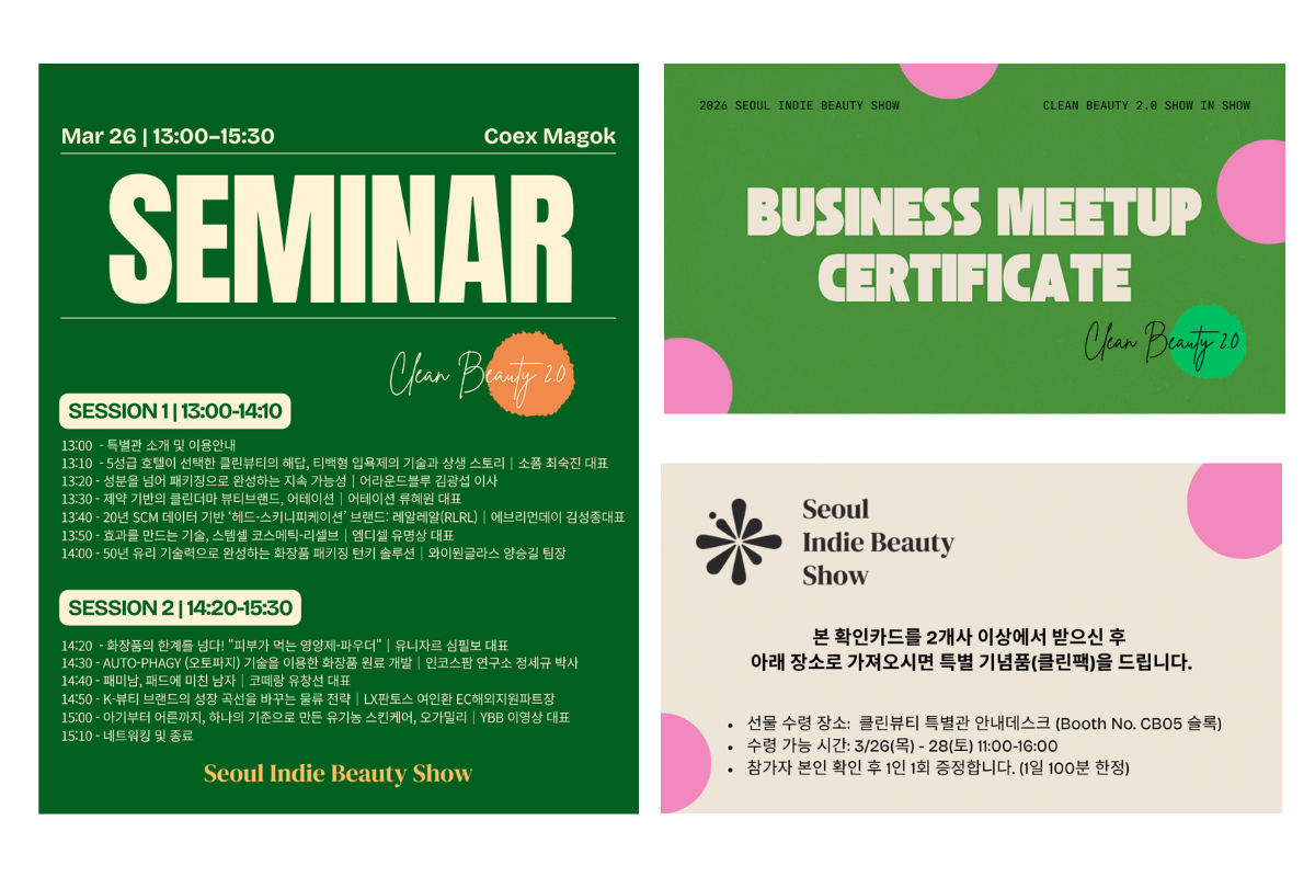 3월 26~28일, 코엑스 마곡에서 열리는 '2026 서울 인디뷰티쇼'! 무료 사전등록이 바로 오늘 마감. 클린뷰티 특별관까지 꼭 알아야 할 정보만 빠르게 정리해드릴게요 👇
