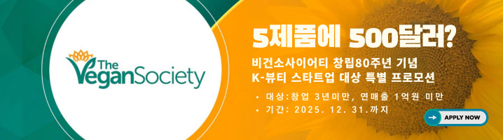 영국 비건소사이어티(The Vegan Society)가 창립 80주년을 맞아 한국 뷰티 스타트업을 위한 파격 프로모션을 진행합니다. 5개 품목 인증을 단 500달러에 받을 수 있는 특별한 기회! 신청 기한은 2025년 12월 31일까지입니다.(대상 : 창업 3년미만, 연매출 1억원 미만)