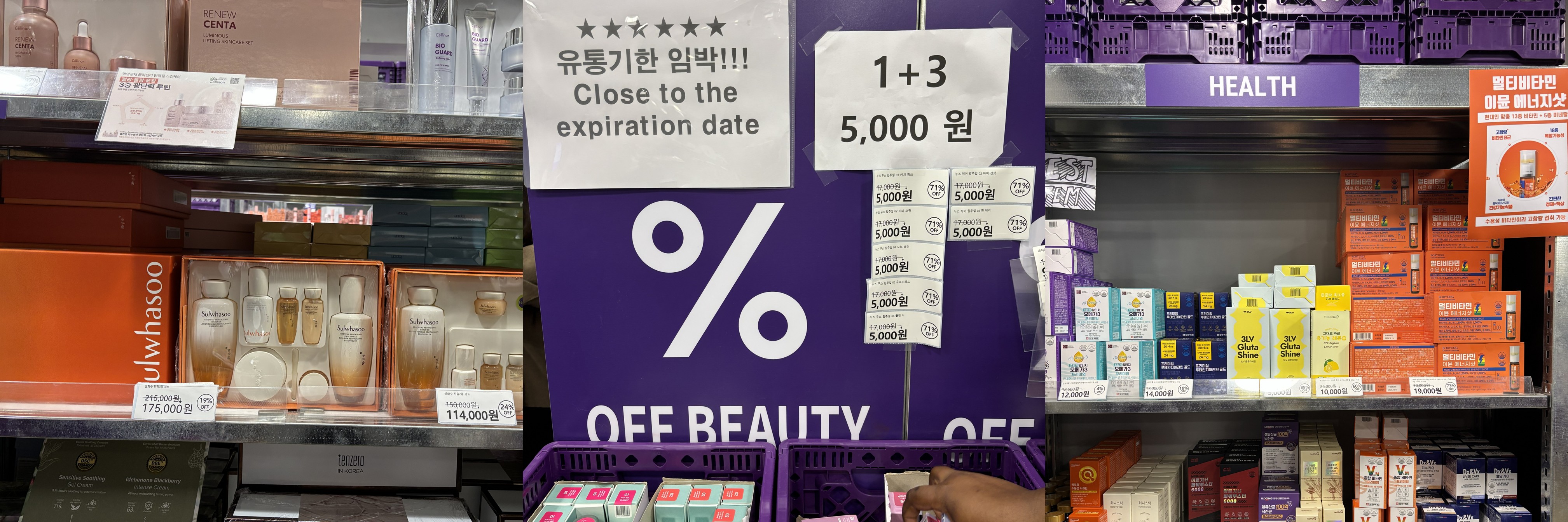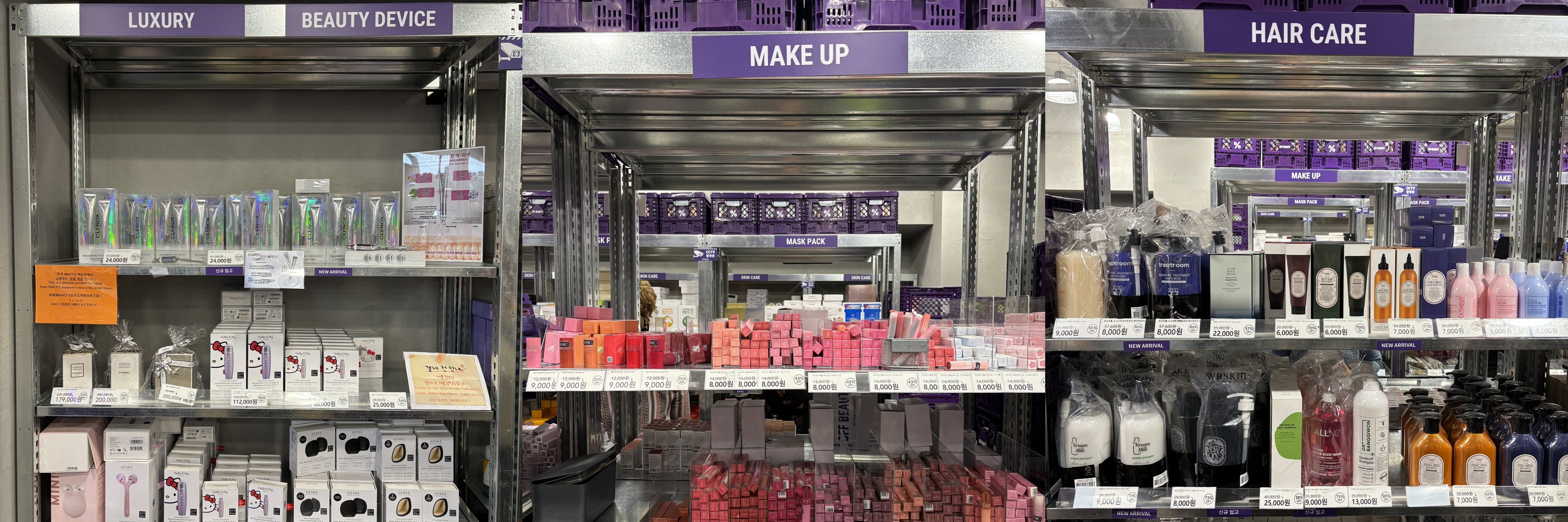 매장은 구역별로 나뉘어 있어요. 앞쪽으로는 할인율이 큰 기획제품들이 박스에 담겨 있어요. 벽을 따라서 스킨케어 존, 색조화장품 존, 향수, 럭셔리, tool 존 등이 있어요. 각 제품 밑에는 할인율과 가격이 큼직하게 표시되어 있어요. 럭셔리존엔 미국 Macy 백화점에서 납품받은 정품들이 진열되어 있어요. 샤넬 등 해외 명품 브랜드도 있어요. 매장 한쪽에는 1+1 프로모션과 90% 할인 태그가 붙은 유통기한 임박 제품 코너가 따로 마련돼 있어요. 화장품 이외에 식음료, 과자 종류와 건강기능식품 또는 보충제 구역도 따로 있어요. 계산대 쪽엔 ‘Tax Refund 안내’ 팻말이 걸려 있었고, 외국인 고객을 위한 안내용 언어 혹은 영문 안내가 눈에 띄어 외국인이 많이 찾는 곳이라는 걸 알 수 있었죠.