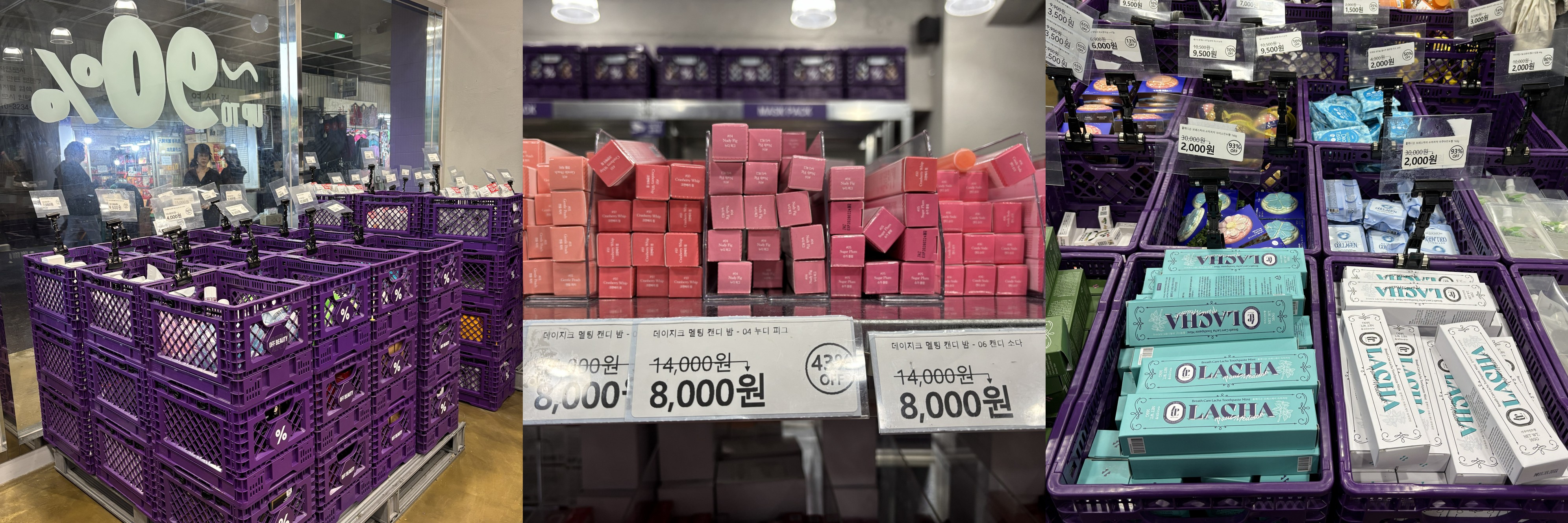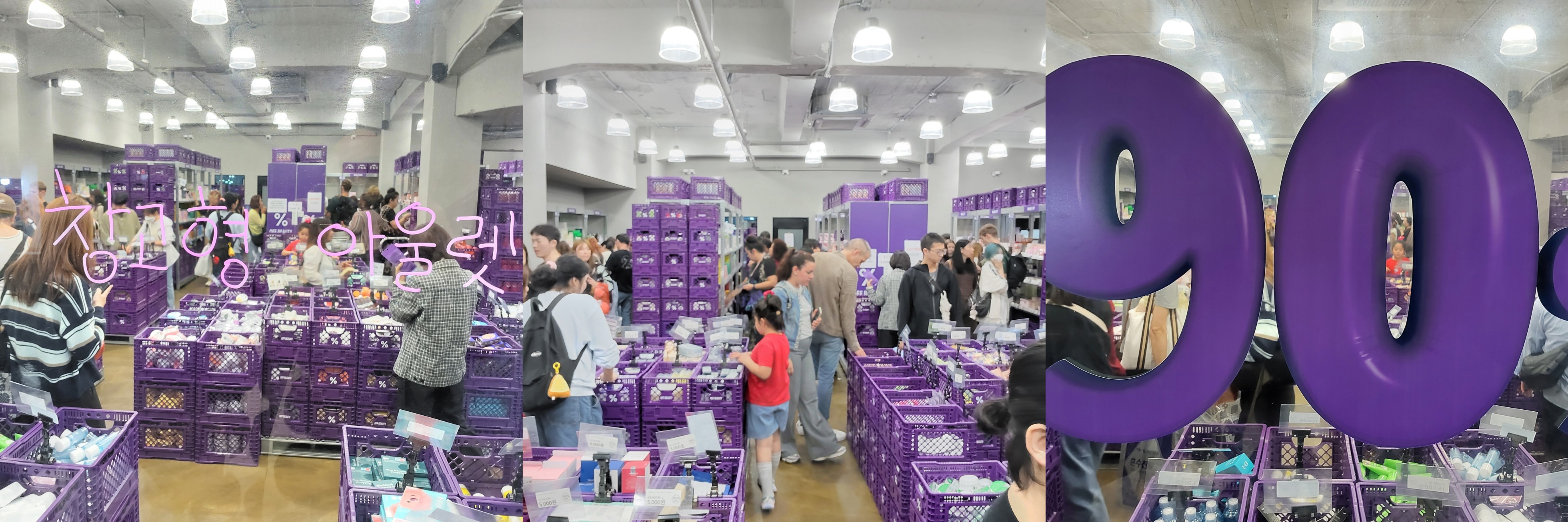 매장 앞에 갔을 때 첫인상은 ‘보랏빛 큐레이션’. 벽면이나 박스, 간판 등 곳곳에 바이올렛 계열 톤이 배치되어 있었고, 공장형 트랙 조명 아래 철제 선반과 박스 적층 구조, 창고 느낌이 강한 레이아웃이었어요. 코스트코와 화장품 전문점을 합쳐 놓은 듯한 분위기. 고급스럽진 않지만, 그래서 더 정직해 보이는 느낌.